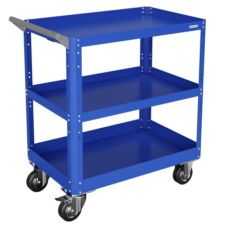 Для размещения и хранения подручного инструмента. Оснащена поворотными прорезиненными колесами размером 4" х 1" (2 колеса оборудованы тормозом). 2 стальные боковые ручки. 3 полки (грузоподъемность каждой полки 40 кг).