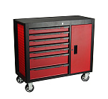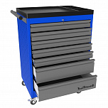 С 7 ящиками. Округлая форма бортовой ручки тележки. Корпус тележки оснащен защитными бортами, что сводит к минимуму риск повреждения оборудования и нанесение травм автомеханикам во время перемещения по СТО. Выдвижные ящики оснащены нескользящими вкладками. В комплекте предусмотрен верхний коврик из EVA, предназначенный для удобного хранения различных мелких деталей. Роликовые направляющие с функцией автоматического возврата обеспечивают плавность открывания/закрывания ящиков. Максимально возможная нагрузка на тележку: 450 кг.