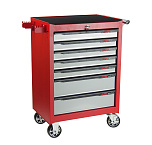 7 ящиков. Оборудована большой прочной пластиковой ручкой. Перфорированные боковые стенки с квадратными отверстиями предоставляют возможность разместить дополнительные аксессуары для хранения инструментов. Роликовые направляющие с функцией автоматического возврата обеспечивают плавность открывания/закрывания секций. Колеса из термопластичного каучука, обеспечивают легкое и бесшумное перемещение тележки. Наличие центрального замка