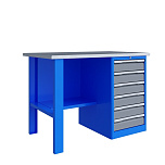 Однотумбовый. Допустимая нагрузка на столешницу 750 кг. Опорные элементы выполнены сварными из холоднокатаной стали. Верстак состоит из столешницы, опоры, тумбы P5 с четырьмя малыми и одним большим ящиком и полки-стенки. Все металлические элементы покрыты полиэфирной порошковой краской. Столешница из фанеры марки ФСФ толщиной 24 мм, которая покрыта лаком-антисептиком и листом оцинкованной холоднокатаной стали толщиной 1,2 мм. Размеры (ВхШхГ) 855x1196x696 мм.