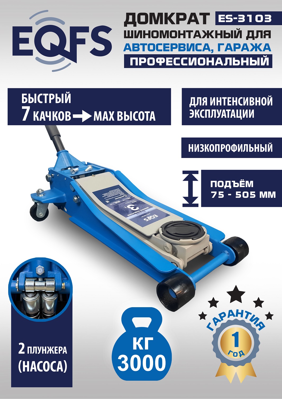 ES-3103 Домкрат подкатной низкопрофильный 3т. Гарантия 1 год. Профессиональный. Для интенсивной эксплуатации. 7 качков для поднятия на макс высоту. Подкатной. Низкопрофильный. Двухштоковый механизм. Усиленная конструкция. Быстрый подъем. Имеет повышенную износостойкость. Поворотная ручка, тавотница, лоток для хранения и резиновая накладка на чашку домкрата в комплекте. Грузоподъемность 3 тонны с усиленными ребрами жесткости. Высота подъема мин / макс - 75-505 мм. ВЕС - 34,5 кг.