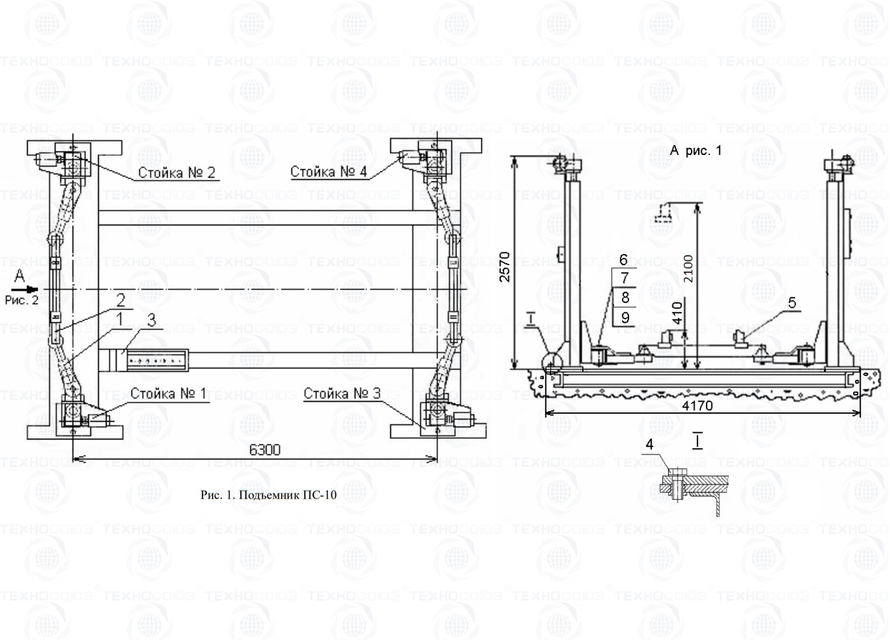 Подъемник состоит из четырех стоек № 1, 2, 3, 4 (см. Рис.), балок поворотных 1 и балок складных 2. Для установки автомобиля в рабочей зоне подъемника предназначен башмак 3. Стойки № 1, 2, 3, 4 подъемника крепятся болтами 4 (см. рис.) к раме, состоящей из двух оснований. Рама забетонирована в пол. Для установки поворотных и складных балок на каретках стоек предназначены оси 6 и осей держатели 7, а также болты и шайбы 8 и 9 для крепления осей держателей. В состав подъемника входит комплект сменных частей 5 с различными подхватами для подъема автомобилей. Стойка состоит из вертикальной колонны, привода подъема и каретки. На стойке № 1 установлен шкаф аппаратный. На стойке № 3 пост управления, на стойках № 2, № 4 коробки клеммные. Колонна представляет собой сварную конструкцию. Привод подъема состоит из электродвигателя, червячного редуктора, соединительных муфт и винта. При вращении винта по нему перемещаются рабочая и страхующая гайки. На рабочую гайку через сферическую шайбу опирается каретка. На каретке закреплен упор (лыжа) для отключения перемещения каретки в крайних верхнем и нижнем положениях, воздействуя на конечные выклюючатели, закрепленные на колонне.