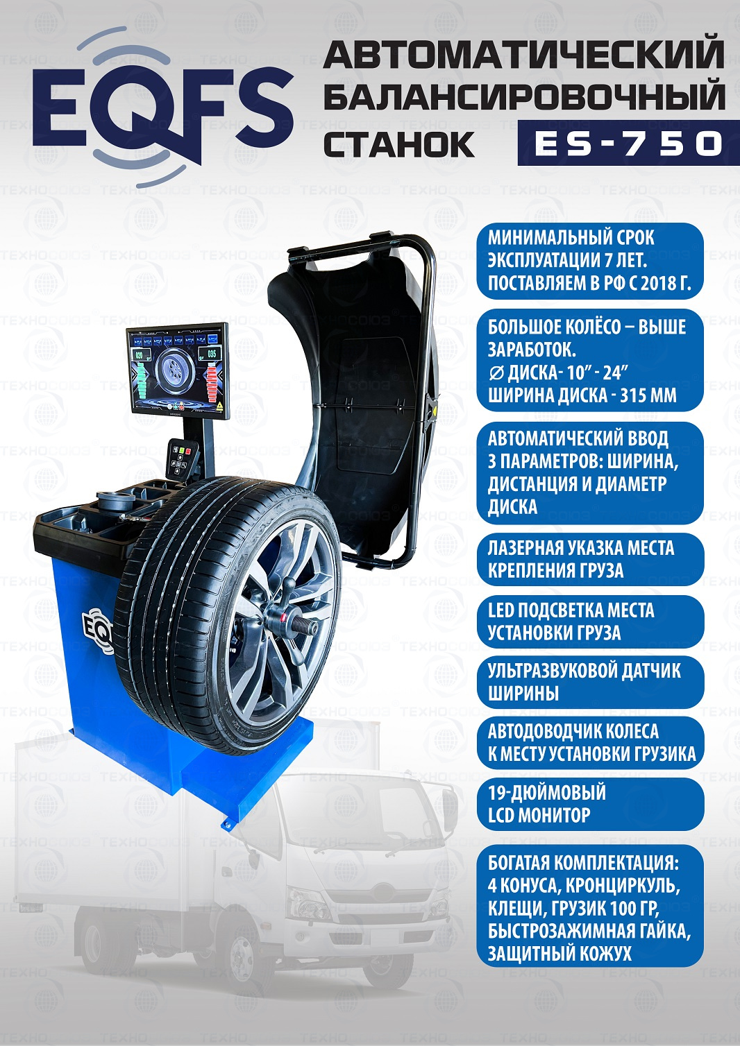ES-750 Автоматический балансировочный станок. Автодоводчик и лазерная указка места установки грузика. Автоматический ввод 3-х параметров. Для колёс шириной 315мм, Ø до 800мм и весом до 65кг. Диски ширина 3–10” (76-254 мм) , диаметр 10–24” (254÷609 мм) Программы: статическая и динамическая балансировка, ALU, OPT, SPLIT, калибровка и самодиагностика. LCD монитор 19 дюймов. Вал Ø - 40мм. Для балансировки колёс легковых автомобилей, мотоциклов, лёгких грузовиков и широких колёс. Гарантия 18 мес – наш монтаж, 12 мес – самостоятельная установка.