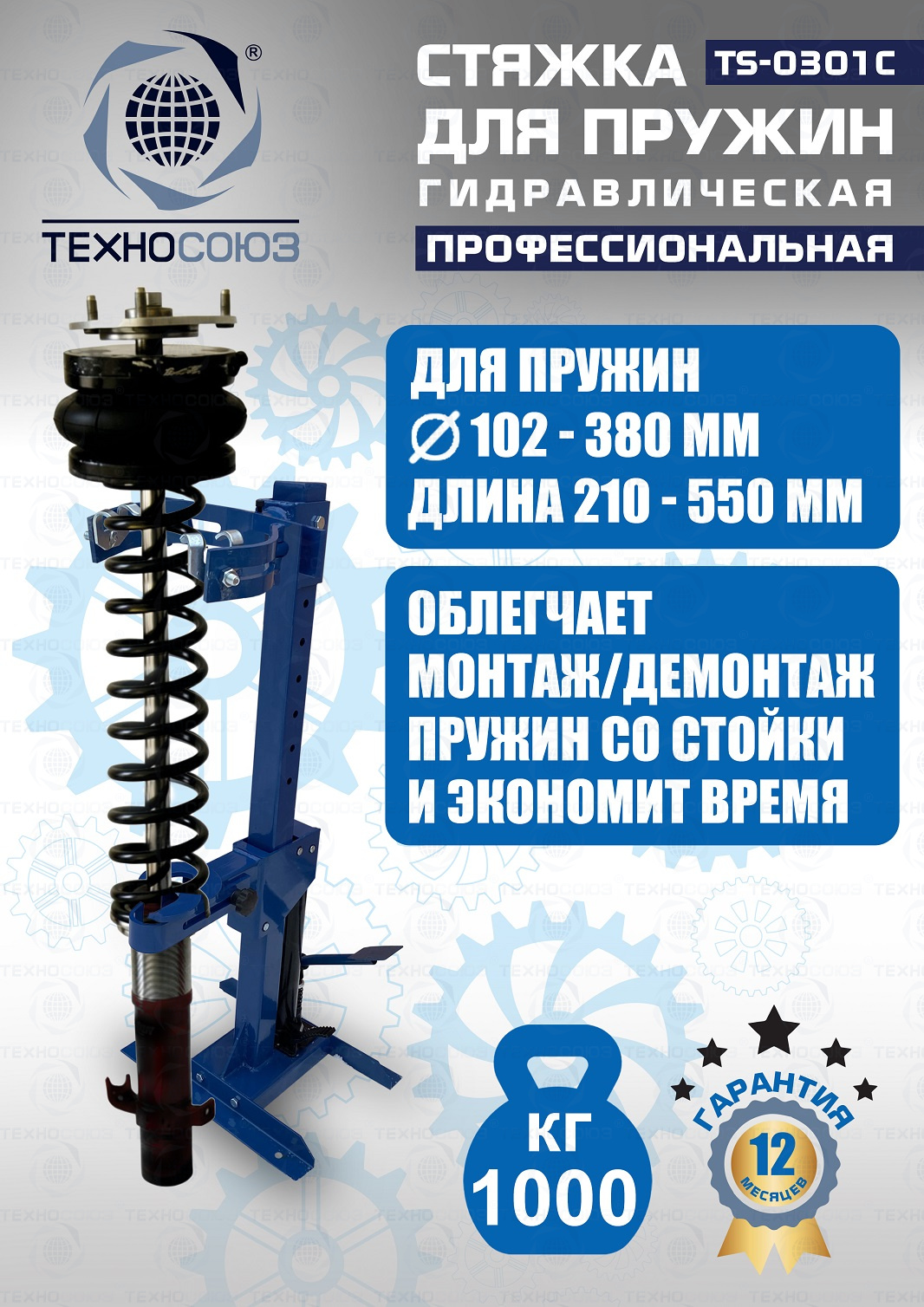 Экономит время. Облегчает монтаж / демонтаж особо прочных пружин со стойки. Профессиональная. Напольная. Гидравлическая. Ножной привод подъема и опускания. Для стяжки пружин легковых автомобилей. Усилие 1000 кг. Длина пружины 210-550 мм. Диаметр пружины 102-380 мм. Ход - 340 мм.